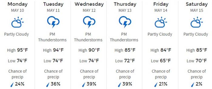 Monday, May 10th will start the week with pretty HOT temperatures — hey, we warned you! That day is going to max out at a 95-degree high and we’ll see 73 degrees at night.
