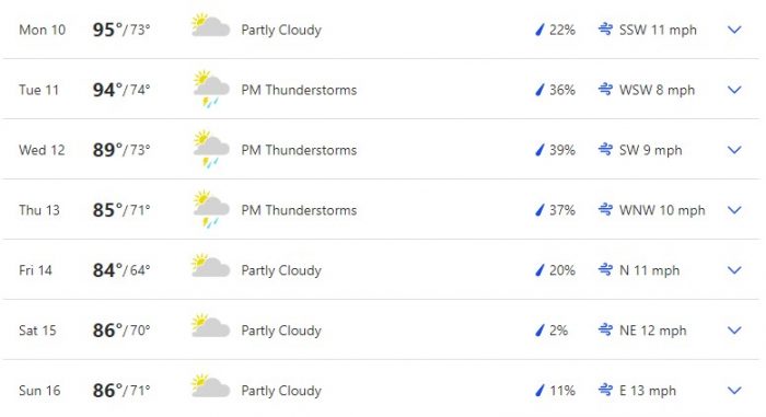 Here is a full overview of the week according to The Weather Channel. Temperatures are projected to hang out in about the same place for the whole week again. We’re looking at a range of 80s to 90s highs and 60s to 70s lows.