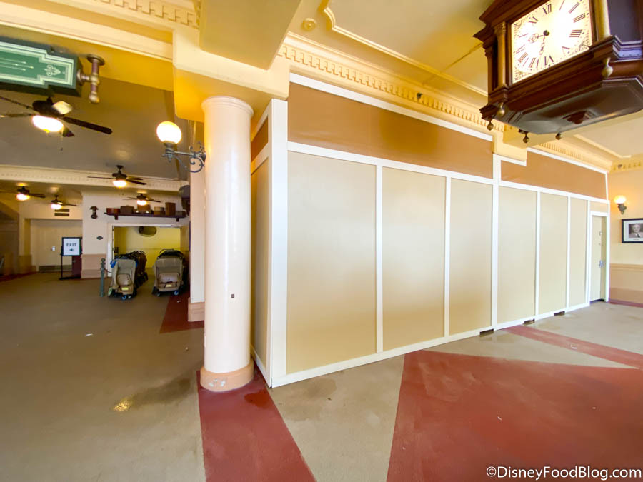 Over on Main Street, U.S.A., we noticed some new construction walls pop up under the Main Street Railroad Station where a portal for the Sorcerers of the Magic Kingdom interactive game used to be.