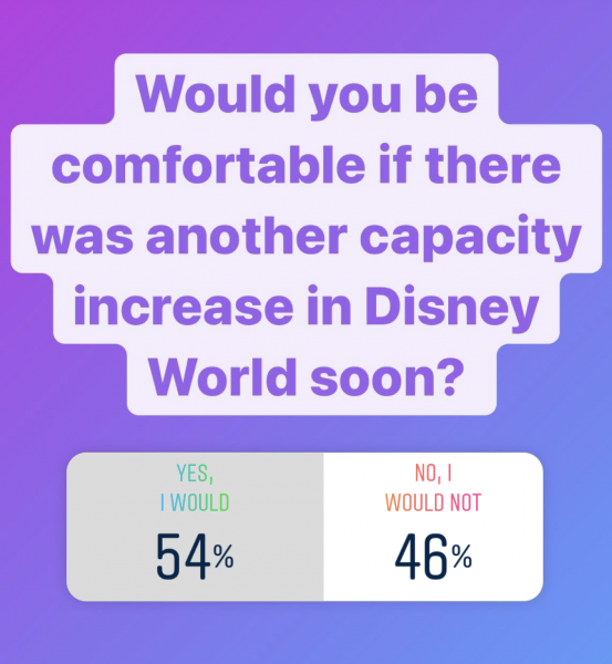 On our Instagram, we reached out to our readers and asked whether you’d feel comfortable if Disney World increased capacity at the parks. Over 13,000 of you responded! And…54% said YES, they’d feel comfortable if capacity were increased, while 46% said they would NOT feel comfortable.