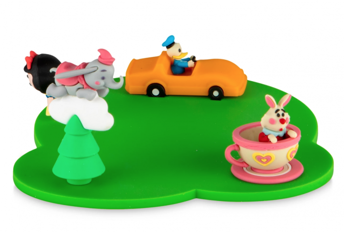 …while the saucer is inspired by popular attractions and character with nods to Dumbo the Flying Elephant, Tomorrowland Speedway, the Mad Tea Party, and Seven Dwarfs Mine Train.