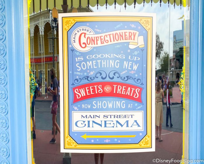 Disney World’s 50th Anniversary is this year and as a result, we’ve seen a LOT of construction around the parks. Main Street, U.S.A. is getting some TLC that has resulted in some store closures — most notably at Main Street Confectionery. Don’t worry though, you can find prepackaged treats nearby at Main Street Cinema.