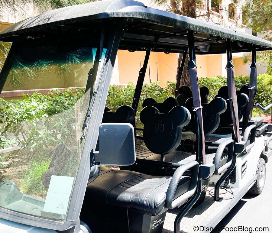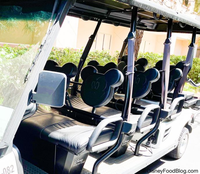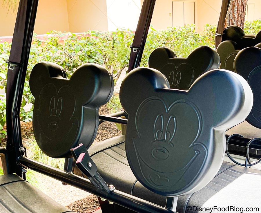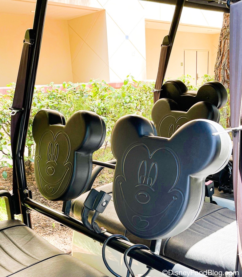 The seats initially look like your standard golf cart-style fare, but the backs of the seats come in a merry Mickey shape!