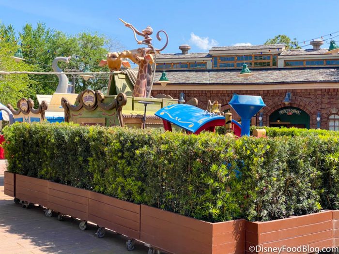 Located in the Storybook Circus section of Fantasyland, the Casey Jr. Splash ‘N’ Soak Station is a water play area themed after the circus train Casey Jr. from Dumbo. And recently, the Casey Jr. circus train was surrounded by hedges in preparation for the coming makeover.