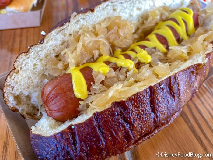 As you might’ve guessed, this dog is served on a pretzel bun! It’s topped with sauerkraut, which was probably our favorite part of the dog overall. The pretzel bun itself was pretty good, but it kept absorbing the sauerkraut, making it a little bit soggy by the time we finished.