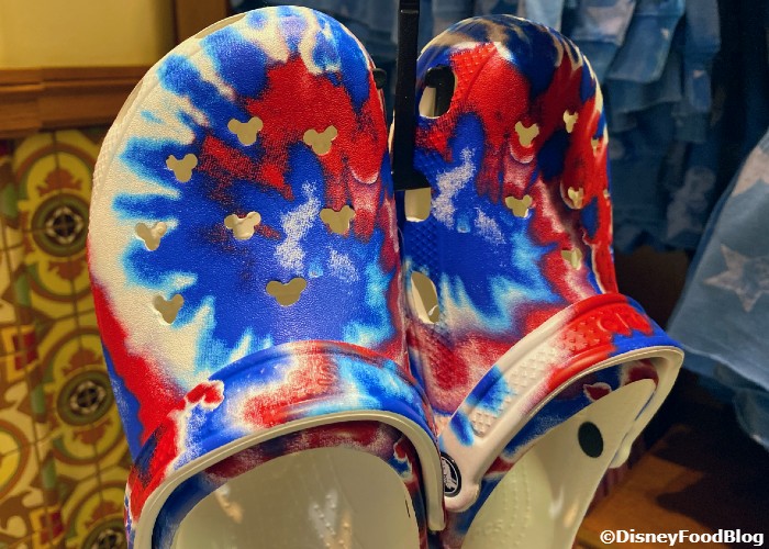 And now we spotted a NEW pair of PATRIOTIC Crocs at Disneyland! Yep, Christmas may feel like it was just yesterday, but we found tie-dye Fourth of July Crocs at Elias & Co. in Disney California Adventure!
