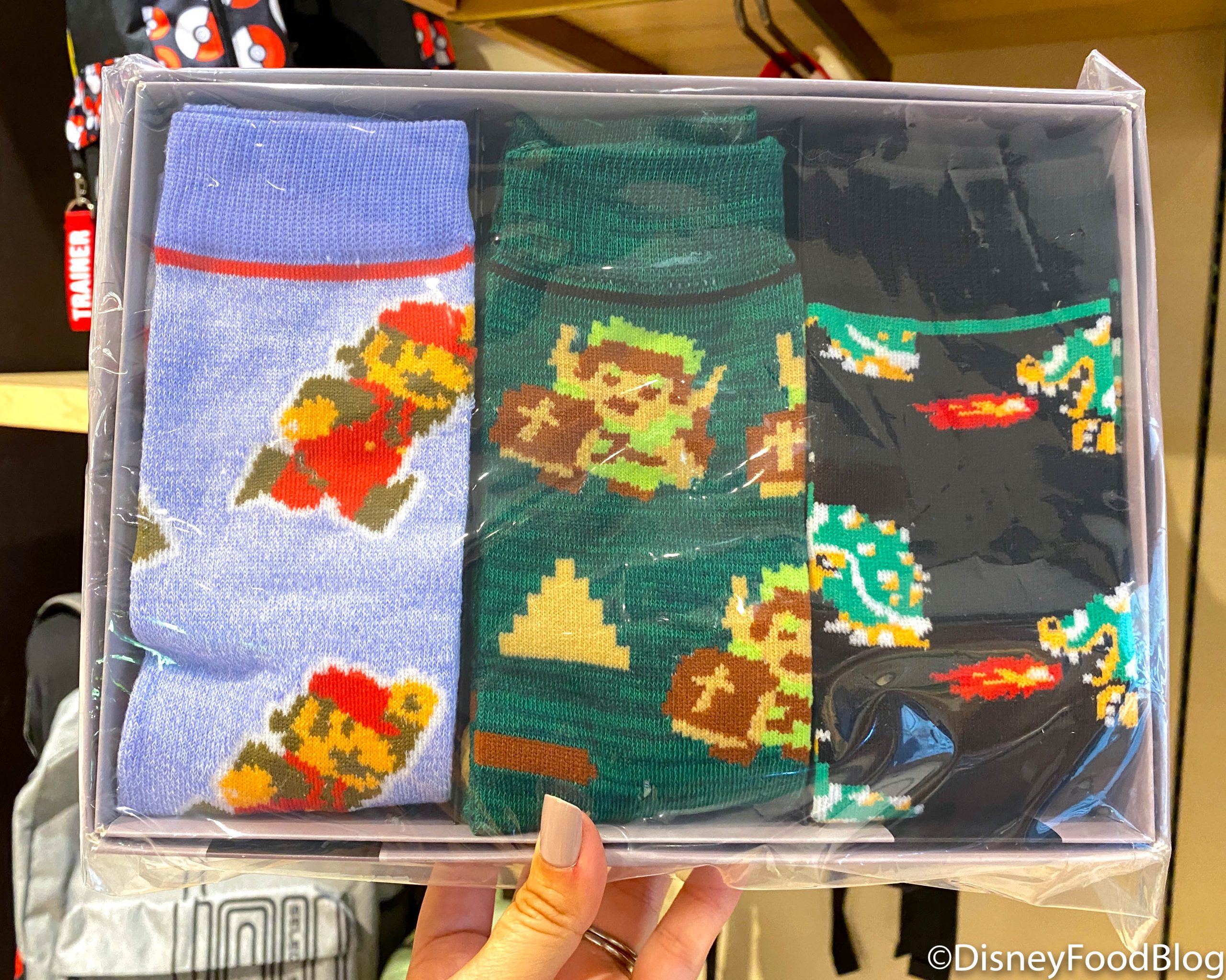 …and the Nintendo Socks with Mario, Link, and Bowser on them in an 8-bit character design for $34.95.
