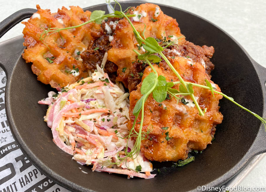 So you’ve heard of chicken and waffles, the classic combo that’s perfect for breakfast, lunch, or dinner…but what happens when you upgrade those waffles? The Chicken and Waffles on the menu at The Polite Pig come with tater tot waffles! That’s right — TATER. TOT. WAFFLES.