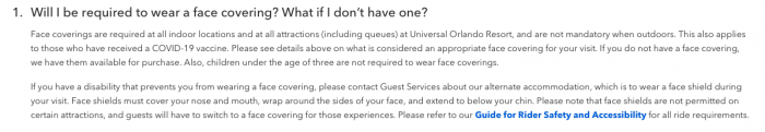 The Universal Orlando Resort website has now been updated to indicate that guests will no longer be required to wear masks outdoors (except in certain situations, more on this below). This update in policy is not specific only to guests that have been vaccinated. All guests, whether they have been vaccinated or not, will fall under this new policy.