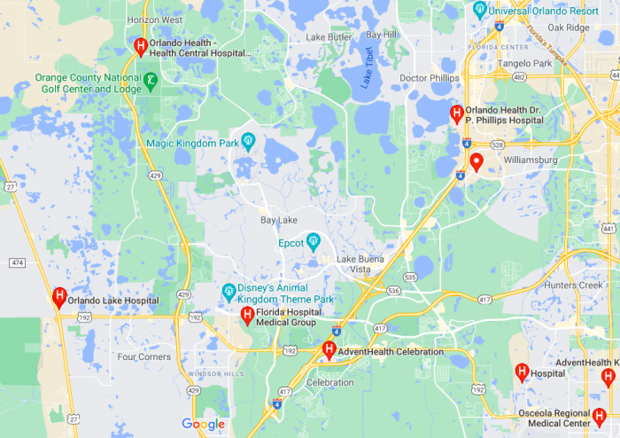 If you can get there yourself, your closest options are AdventHealth Celebration (which functions more as an urgent care) and the Orlando Health Dr. P. Phillips Hospital (which is a full-fledged hospital). If for some reason you cannot get to that hospital, you can visit either Orlando Lake Hospital or Orlando Health Horizon West Hospital. All are labeled on the map below.