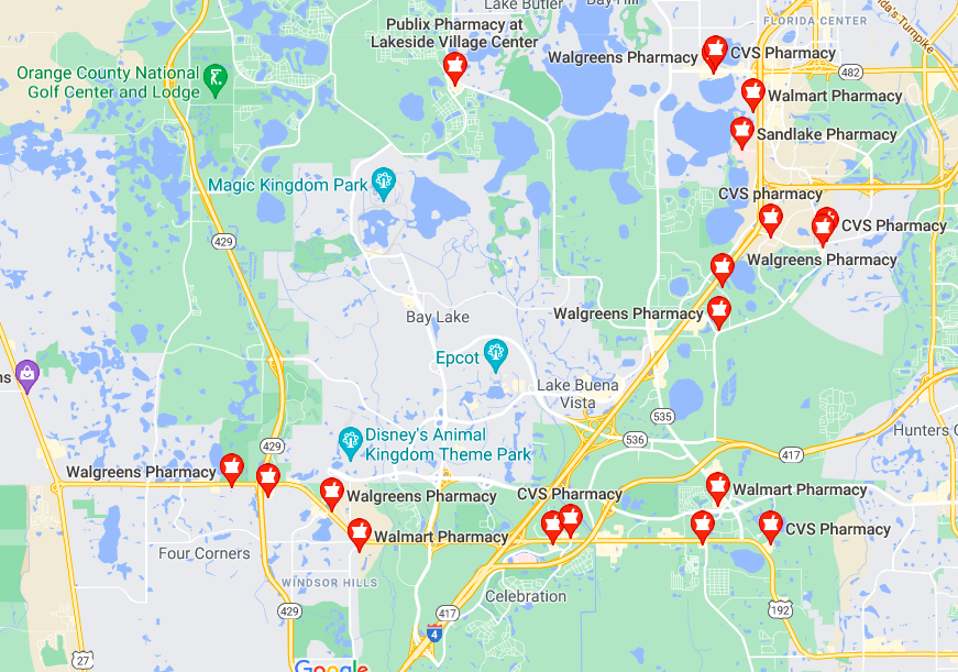 Most pharmacies in the area are either Walgreens, CVS, Walmart, or Publix, so do keep that in mind if you’re ordering a prescription that needs to be picked up.