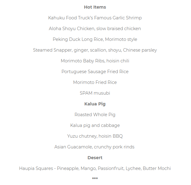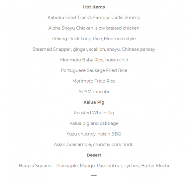 We can’t continue without mentioning the FOOD. The menu is huge! It’s packed with sushi, roasted pig, and plenty of other Asian and Pacific-inspired items! The food will be available at stations, including poke and sushi bars.