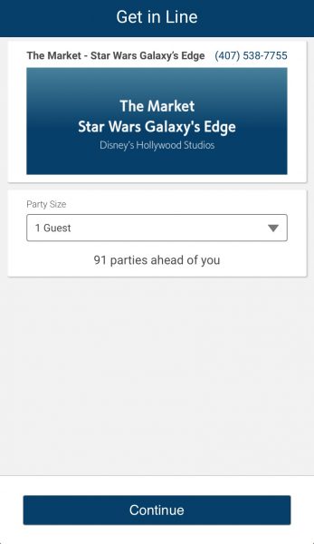 You’ll then be prompted to enter your party size. You will also be notified of how many parties are ahead of you. Click on “Continue.”