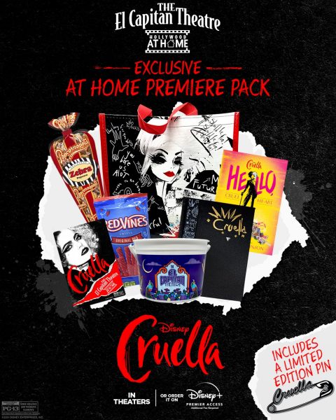 The At Home Premiere Pack includes a limited edition pin, Hello Cruel Heart (which is Cruella’s prequel book), a ‘Cruella’-themed reusable bag, a randomly selected ‘Cruella’-themed journal, a theater credential and lanyard, PLUS Zebra Popcornopolis Mini Cones, and a bag of Red Vines Licorice. So, you can snag some of the brand new ‘Cruella’ merch AND candy for $70.