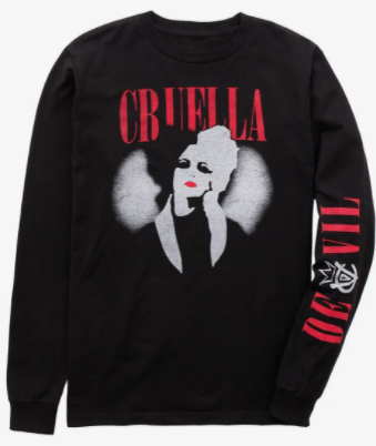 The black long sleeve T-shirt shows a stylized portrait of Cruella with her name above her in red. De Vil is featured on the sleeve on the shirt in the same striking red font!