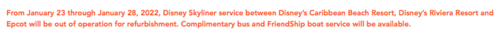 UPDATE: The Disney World website now has a note about this refurbishment. Disney’s notice on the website for Disney’s Beach Club Resort specifically states that during this period Skyliner service between Disney’s Caribbean Beach Resort, Disney’s Riviera Resort, and EPCOT will be out of operation.