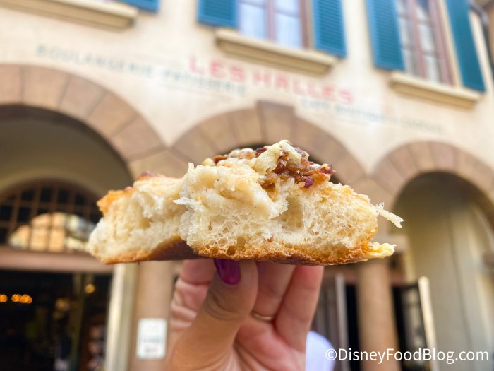 A few days ago we found that one of our favorite bacon and cheese roll (aka the Roulé aux Fromage) had returned to Les Halles Boulangerie Patisserie in the France Pavilion at EPCOT. And, while we were excited to reunite with the cheesy, bacon-y goodness, there was one thing lacking — the bacon. But, the Cast Members in the France Pavilion were watching and they RESPONDED with MORE bacon! So, we had to go over and check it out!
