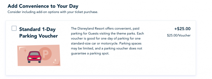 When you go to Disneyland’s website to purchase your tickets, it will ask you to make your Park Reservations at that time. Once you select the date(s) you wish to visit, it brings you to a new page where you can purchase a parking voucher for $25.
