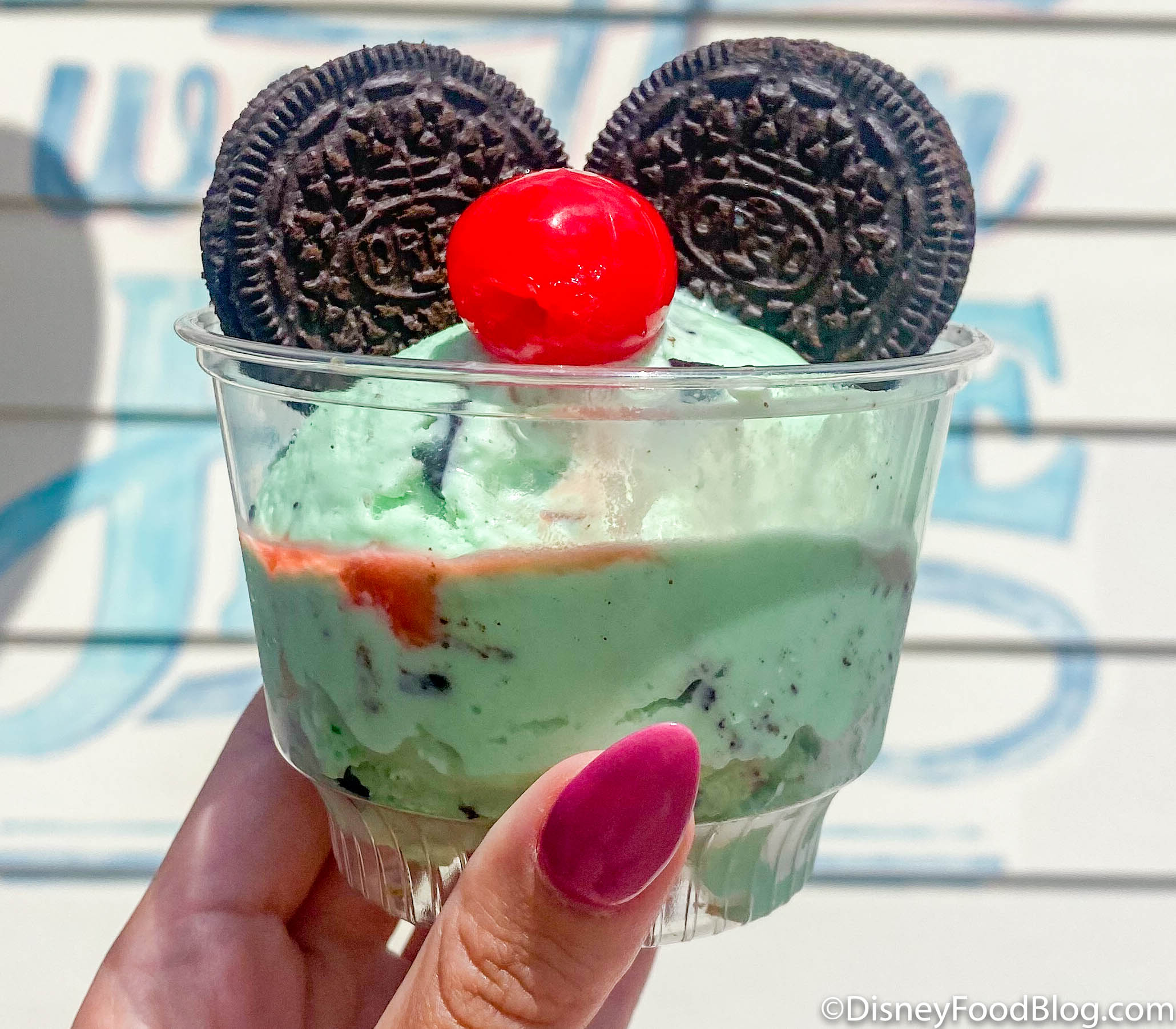 Finally, we couldn’t leave without trying the Kids’ Mickey Mouse Sundae! This one comes with 1 scoop of the ice cream of your choice (we went with Mint Chocolate Chip) with chocolate cookies (Oreos) and a cherry and it’s priced at $4.49.