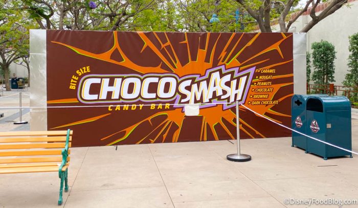 We were exploring the Disneyland parks today when we spotted that new signage has been added in Hollywood Land near Avengers Campus. What caught out eye first? Nothing other than this GIANT ChocoSmash Chocolate Bar!