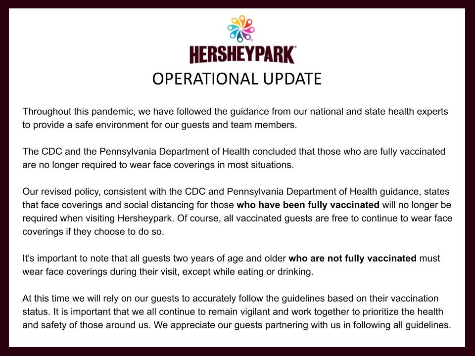 After the CDC released their updated mask policies, Hershey Park in Pennsylvania quickly announced changes to their policies. In Hershey Park, guests who are fully vaccinated do not have to wear face coverings or social distance.