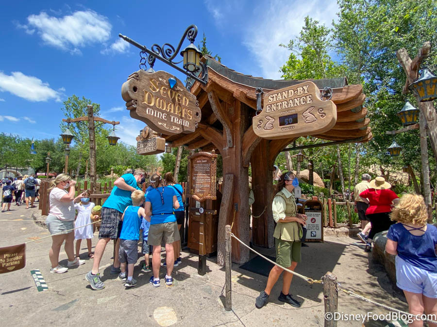 Now, what qualifies as a “ride queue?” After all, some lines can stretch far past their normal points due to social distancing. Based on our conversations with Cast Members and what we’ve seen, the new mask policy is generally being enforced once you’re in the “official” queue (for example, when you pass under the sign for Seven Dwarfs Mine Train). In the overflow queue, guests can generally have their masks off. But, be sure to listen for any different instructions that may be provided to you by the Cast Members at that particular location.
