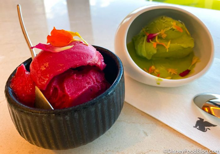 For dessert, we tried some gelato! The Hibiscus Lemongrass Gelato is that cranberry color, while the Green Tea Gelato is — ya guessed it — green.