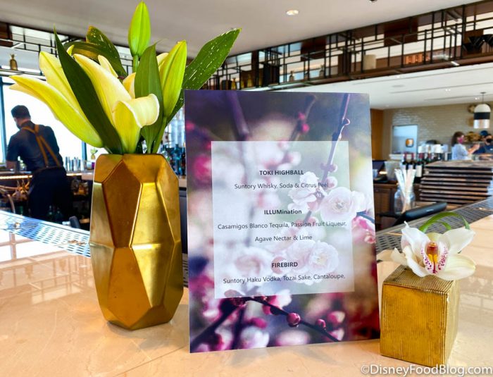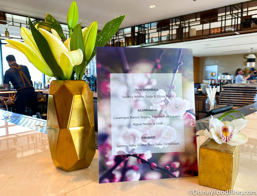 Three signature cocktails are highlighted at the bar: the Toki Highball, ILLUMination, and Firebird.