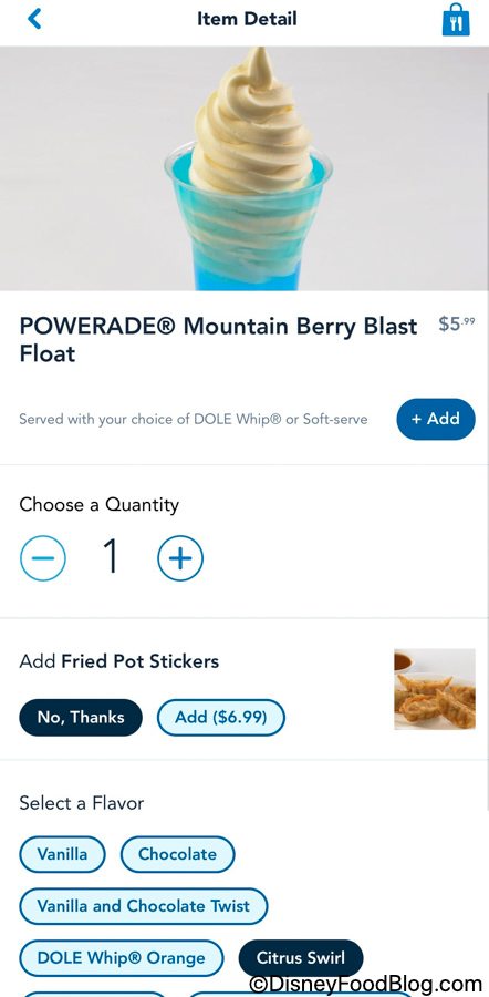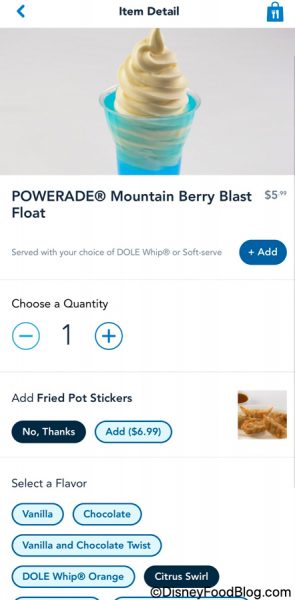 The Powerade Mountain Berry Blast Float combines the famous blue sports drink with a float of your choosing! You can get it served with different Dole Whip, Citrus Swirl, or soft serve flavors. The options are all listed on Mobile Order. We chose to get ours with a Citrus Swirl!