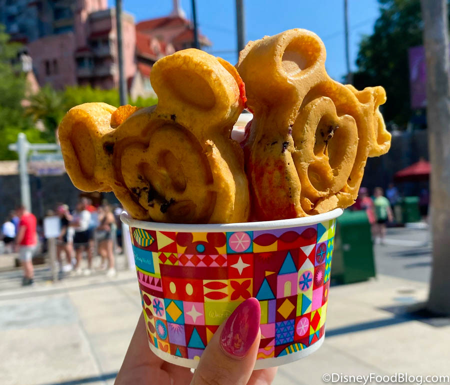 We wanted to remind you of a sweet breakfast option over at Hollywood Scoops! You can snag a Mickey Waffle Platter for $9.50 — that comes with 3 blueberry Mickey waffles, whipped cream, syrup, and strawberry compote! Then, get a cup of ice cream in the flavor of your choice for $5.49.
