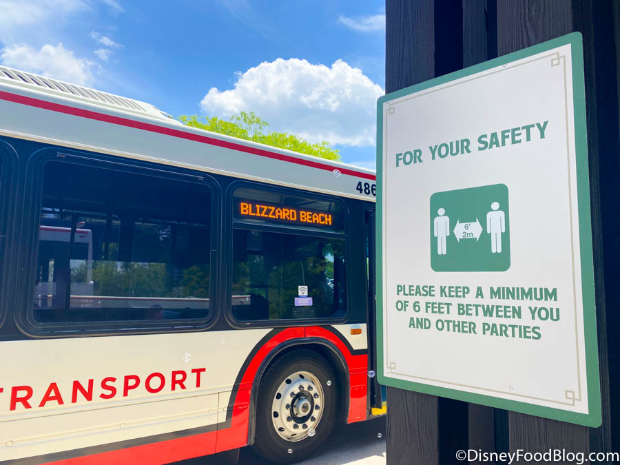 Similarly, where the line stretches to board the bus, a sign tells guests to keep 6 feet apart. However, social distancing markers in that line have been removed.