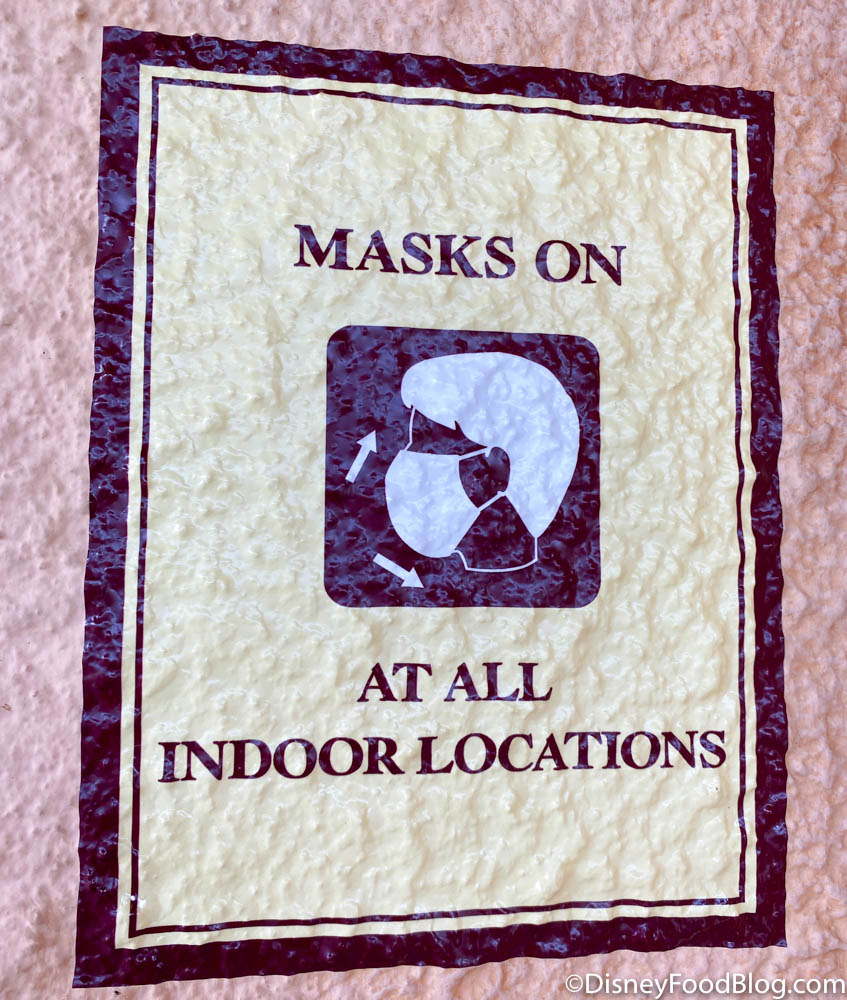 You’ll also see signs around property reminding guests to wear a face covering at all times while indoors. This is a relatively new one, so it’s still popping up in various places. We spotted this one in Disney’s Hollywood Studios.