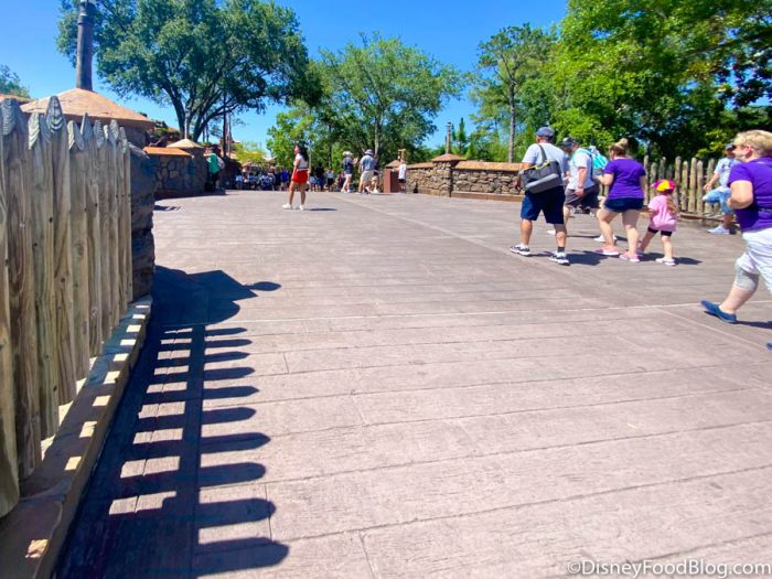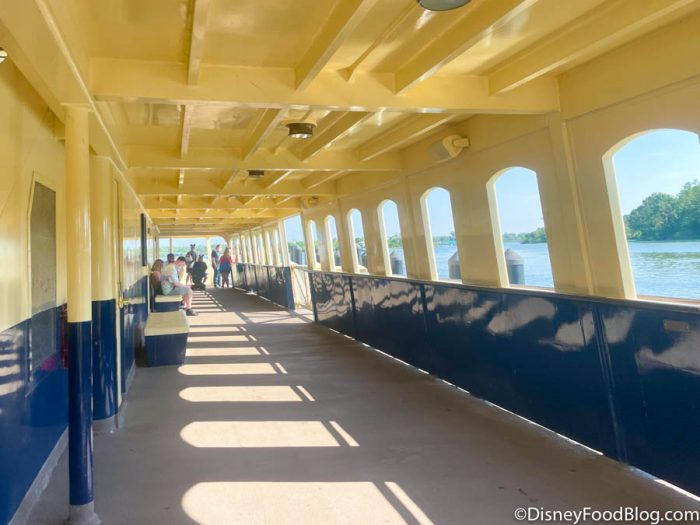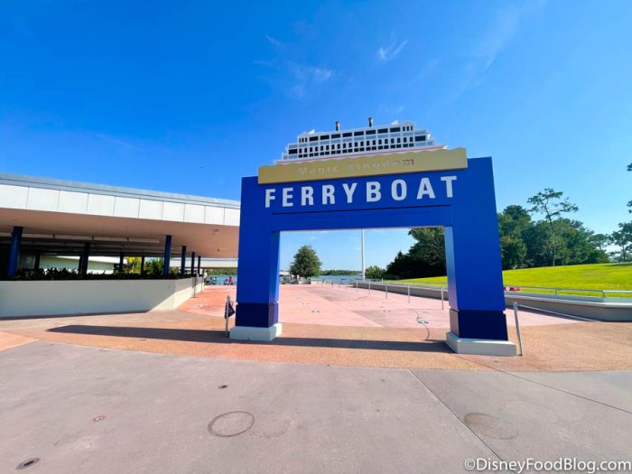 If you choose to take the ferry boat to Magic Kingdom instead, social distancing markers have been removed until you cross under the “Ferry Boat” archway, but are still in place after.