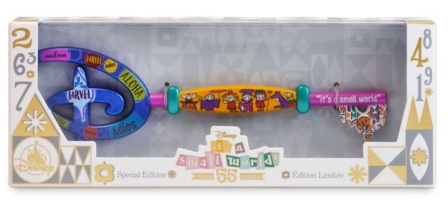 The key celebrates the 55th Anniversary of the small world attraction at Disneyland. It comes in a decorative display box and is covered in adorable designs featuring the children of the world and various greetings.