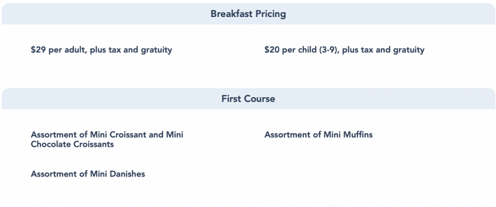 For breakfast, your meal will cost ya $29 per adult (and $20 per kiddo!). Dinner is $39 for adults and $25 for little ones. The first course includes an assortment of mini croissants, mini muffins, or mini danishes!