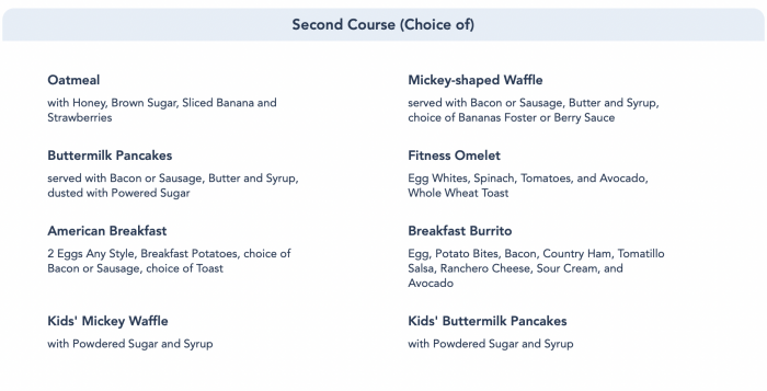 The entrees for breakfast include typically breakfast fare like oatmeal, pancakes, Mickey waffles, and more!