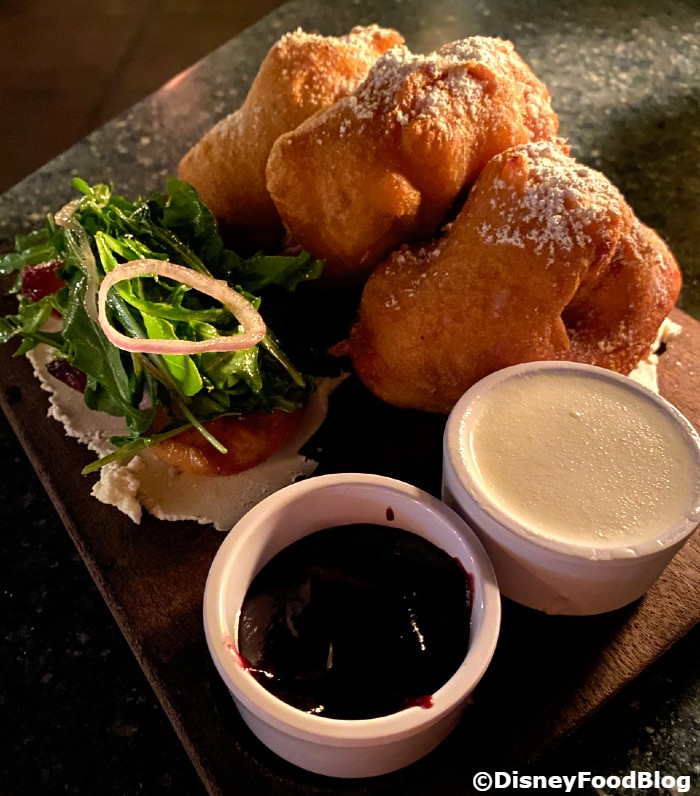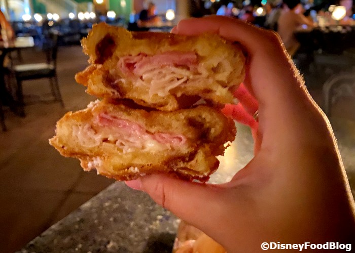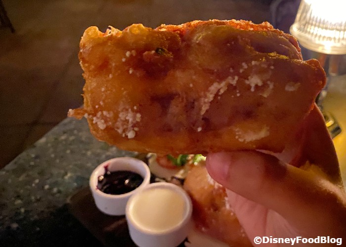 This Monte Cristo is cut into three wedges, which are all deep-fried whole, so you get a LOT of crispiness here. Unlike its other home at Cafe Orleans, this version comes with TWO dipping sauces — a “seasonal” preserve (blackberry for us) and Créme Anglaise (basically a thick sweet vanilla cream sauce). The sammie is dusted in powdered sugar too. This is a classic Disneyland favorite but, if you’re not familiar with the sandwich, you might be confused by the sweet-savory of it all. Trust the Monte Cristo. Dip, dip. Repeat. It’s all worth it.