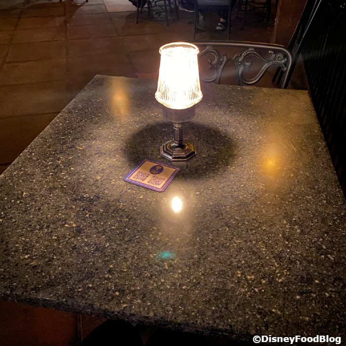 Of course, since Disneyland reopened in April, there have been some extra health and safety precautions. The tables at this restaurant feature tiny lamps so you can read the menu. But like other restaurants at the resort, the lamps are illuminating a QR code for the menu right now.
