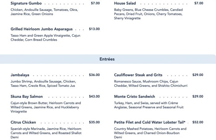 For Appetizers, you can select from soup (gumbo), a salad, or grilled asparagus. The Entrees aren’t too “in your face” Cajun or Creole here, like the setting would suggest. You’ll find a Jambalaya, but otherwise there’s a fish, chicken, surf and turf, and veggie, and sandwich option (yep, the beloved Monte Cristo is back, friends! We tried it at Cafe Orleans recently, but you can get a full-sized serving here!)