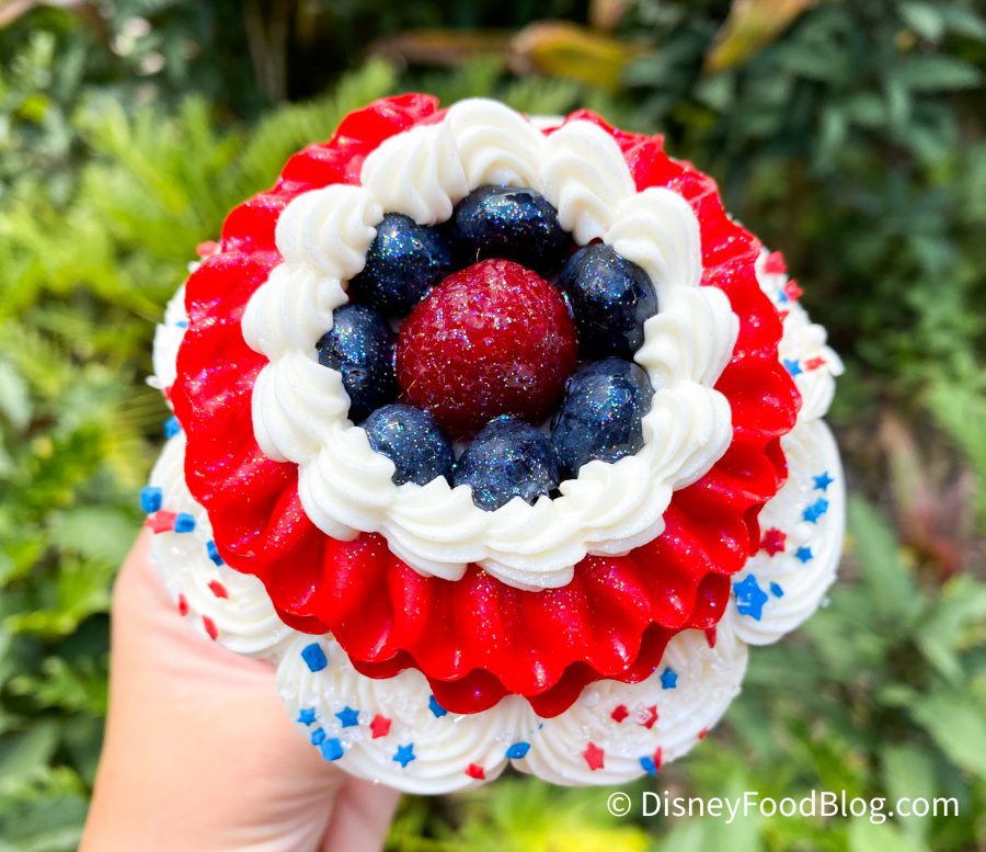 We also got to try the Firecracker Cone! It’s Raspberry Soft Serve with Patriotic Sprinkles and Popping Firecracker Candy. WOWZA. Like we already love the Raspberry Dole whip, but the popping candy just took it up a notch.