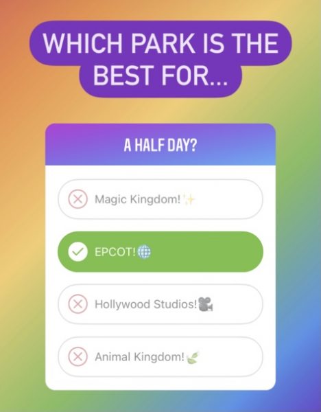Well, we did what we usually do here at DFB: we polled our readers on Instagram! We asked them which park was the BEST for a half day and waited while the results rolled in. (Keep in mind that there’s no right or wrong answer — despite that green check next to EPCOT!).
