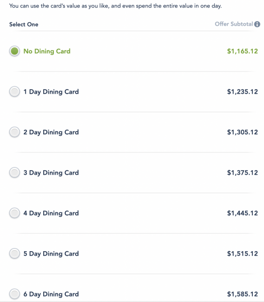 When you click on “Add Dining Card”, you can choose how many days you would like the Dining Card. Another thing to note is that this is a good way to save money on quick-service because the value of the card is MORE than what you’re actually paying!