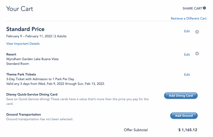 However, when we changed our hotel to a Disney Springs hotel, the option popped up on the page before you checkout.