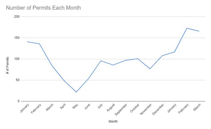 See? There’s that big dip from February to May and then a sloooooow climb back to normal levels. February and March have both yielded upwards of 150 permits.