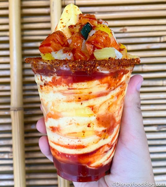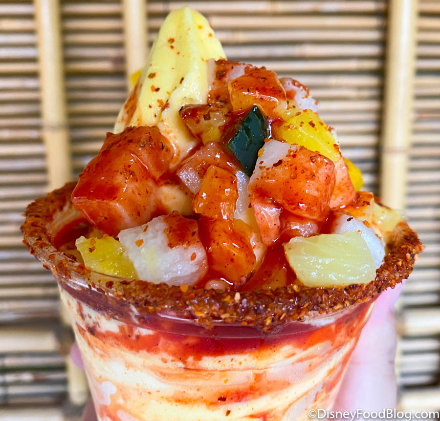 This treat comes with Pineapple-Mango Dole Whip and is topped with chunks of pineapple, jicama, cucumber, and mango. It’s also got chamoy and is sprinkled with a chile-lime seasoning!