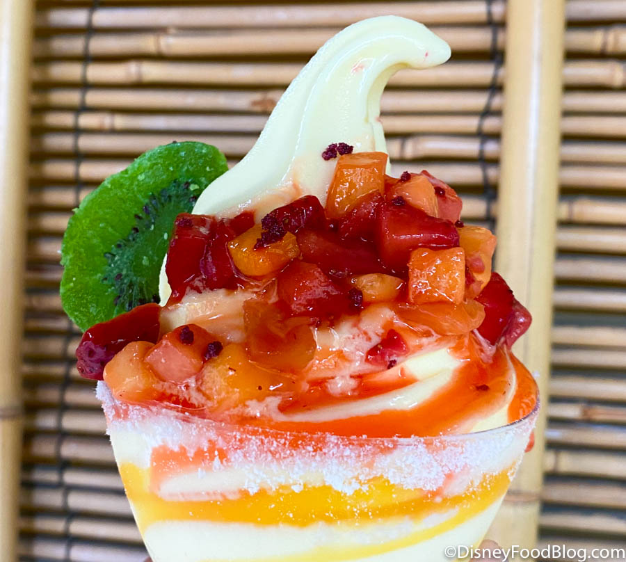 While we were here, we also snagged the brand-NEW Dole Whip Raspberry Lemon Float! You can get this (and that Chile-Mango Dole Whip!) with ANY Dole Whip flavor on the menu, so we opted for good ol’ Pineapple Dole Whip. It’s topped with strawberries, mango, and candied kiwi — and comes with POG juice!