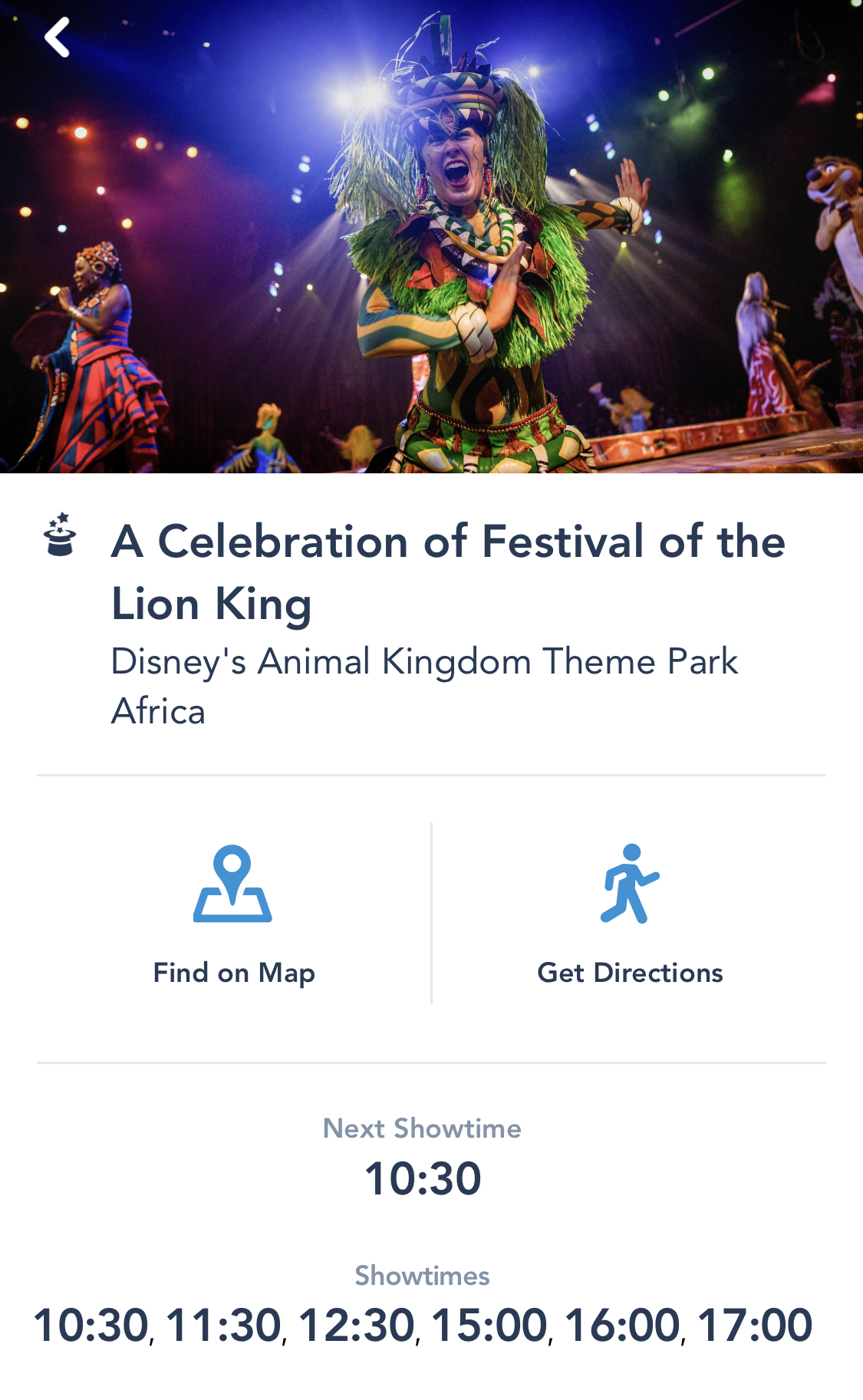 The Festival of the Lion King has added 2 daily showtimes to the schedule: 10:30AM and 11:30AM! You’ll see this change reflected on the My Disney Experience app. Previously, shows only took place at 12:30PM, 3:00PM, 4:00PM, and 5:00PM.