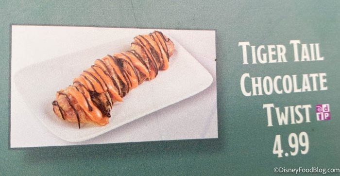 You can also get a VERY similar treat over in Disney’s Animal Kingdom for a little cheaper! The Tiger Tail is $4.99 and can be found at Isle of Java. The only difference from the Cheshire Cat Tail is that the icing is orange and black instead of pink and purple.