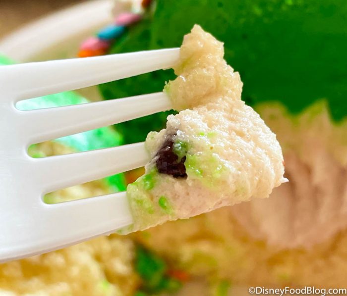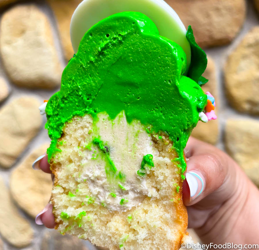 The vanilla cake is your basic, everyday Disney cupcake: it’s dense and fluffy, but nothing too special. As for the caramel frosting? Well, we didn’t really taste the caramel. It screamed super-sweet vanilla grocery store frosting to us!