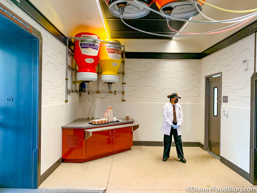 Giant ketchup and mustard bottles and oversized soda cans hang from the ceiling as well. Can we just tap into that line and drink our soda straight from there? That would be fun! 😜